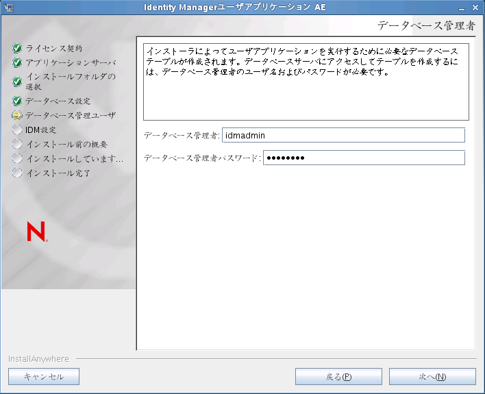 インストールプログラムはユーザアプリケーション管理者フィールドから値を取得し、それを次の値に適用します。