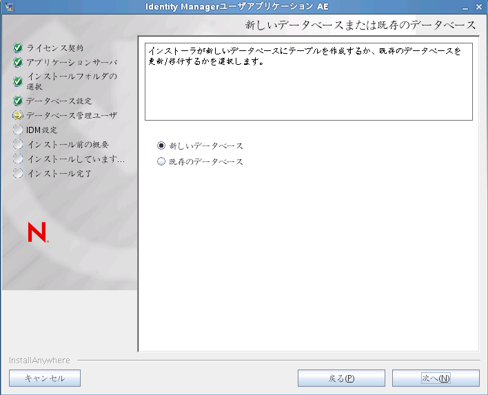 使用するデータベースが新規または空の場合、ボタンを選択します。データベースが以前のインストールに属する既存のものである場合、ボタンを選択します。