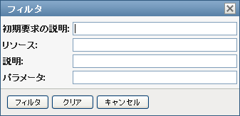 リソース割り当てに関連した初期要求説明、リソース名、説明、またはパラメータのフィルタ文字列を指定します。