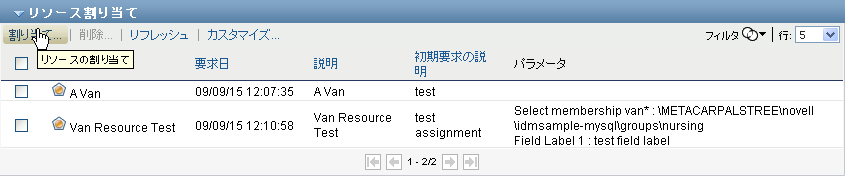 コントロールで何も選択されていない場合、リソース割り当てリストには現在のユーザのリソース割り当てが表示されます。これらのリソース割り当てには、自分が受信者または割当先ユーザのいずれかであるタスク、および受信者または割当先ユーザが現在ユーザが属するグループ、コンテナ、役割であるリソースが含まれています。ユーザは、自分のリソース割り当てにはすべての操作ができます。自分自身のリソースを使用するために必要な権限はないためです。