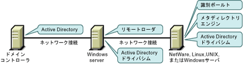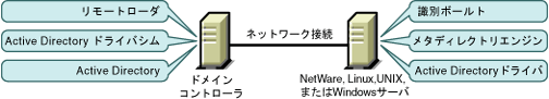Active Directoryドライバシムは、サポートされているいずれかのWindowsプラットフォームで実行する必要があります。ただし、この同じコンピュータにメタディレクトリエンジンをインストールする必要はありません。リモートローダを使用すると、エンジンとドライバシムを分離できます。それにより、さまざまなコンピュータの負荷を分散したり、会社の指示に対応することができます。