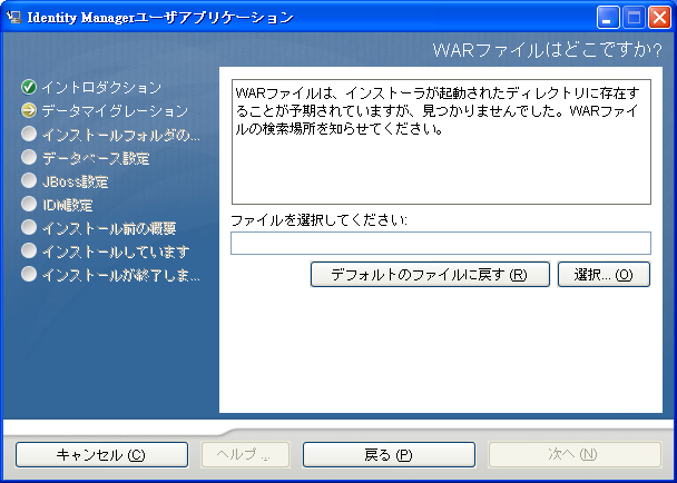 WARがデフォルトの場所にある場合は、[デフォルトのファイルに戻す]をクリックします。または、WARファイルの場所を指定する場合は、[選択]をクリックして場所を選択します。