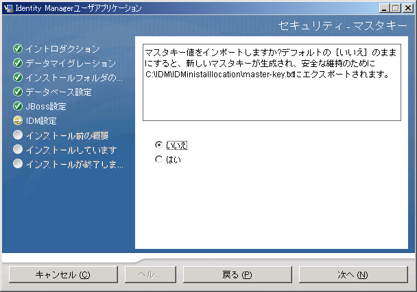 []を選択する場合は、セクション 4.14, ユーザアプリケーションの設定までスキップされます。インストール終了後、セクション 7.1, マスタキーの記録で示すように、マスタキーを手動で記録します。