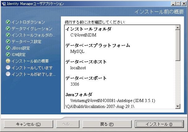 必要に応じて、[戻る]を使用して前のインストールページに戻り、インストールパラメータを変更します。