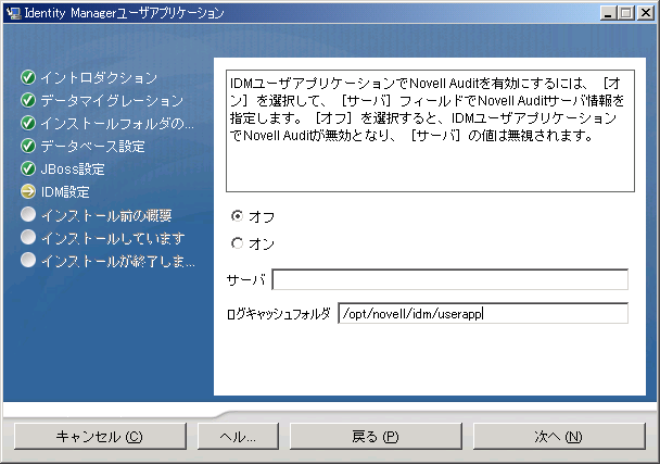 ユーザアプリケーションでNovell Auditのログが無効になります。 ユーザアプリケーションの[管理]タブを使用すると、後で有効にできます。