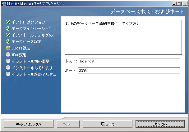 [次へ]をクリックして、セクション 4.8, データベース名および権限を持つユーザの指定に進みます。