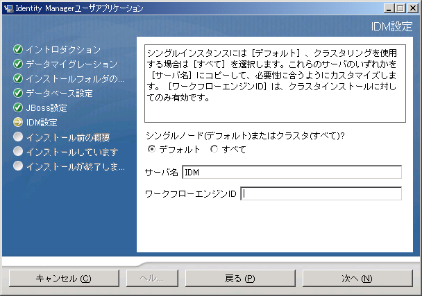 このインストールが、クラスタの一部でない1つのノード上の場合は、[デフォルト]を選択します。