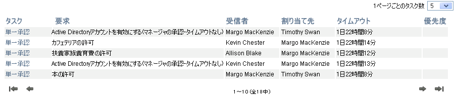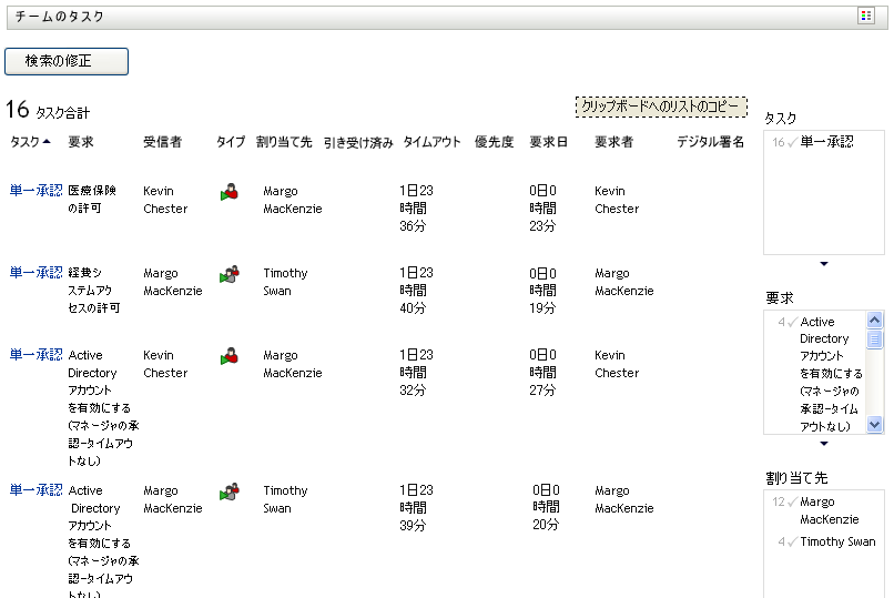 たとえば、[割り当て先]フィルタでMargoの名前をクリックして、[要求者]フィルタでKevinの名前をクリックした場合、図 12-4に示すように、Margo Mackenzieに割り当てられていて、かつKevin Chesterが要求したタスクのみが表示されます。