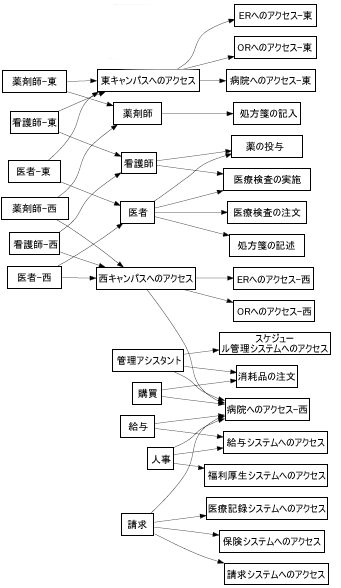 役割階層は3つのレベルをサポートしています。最上位レベルに定義されている役割(ビジネス役割)は、組織内においてビジネス的な意味を持つ業務を定義します。中間レベルの役割(IT役割)は、技術的な機能をサポートします。階層の最下位レベルで定義されている役割(許可役割)は、下位レベルの特権を定義します。次の例は、3レベルで構成されるある医療機関の役割階層のサンプルを示しています。左側に階層の最上位レベルがあり、右側が最下位レベルになります。