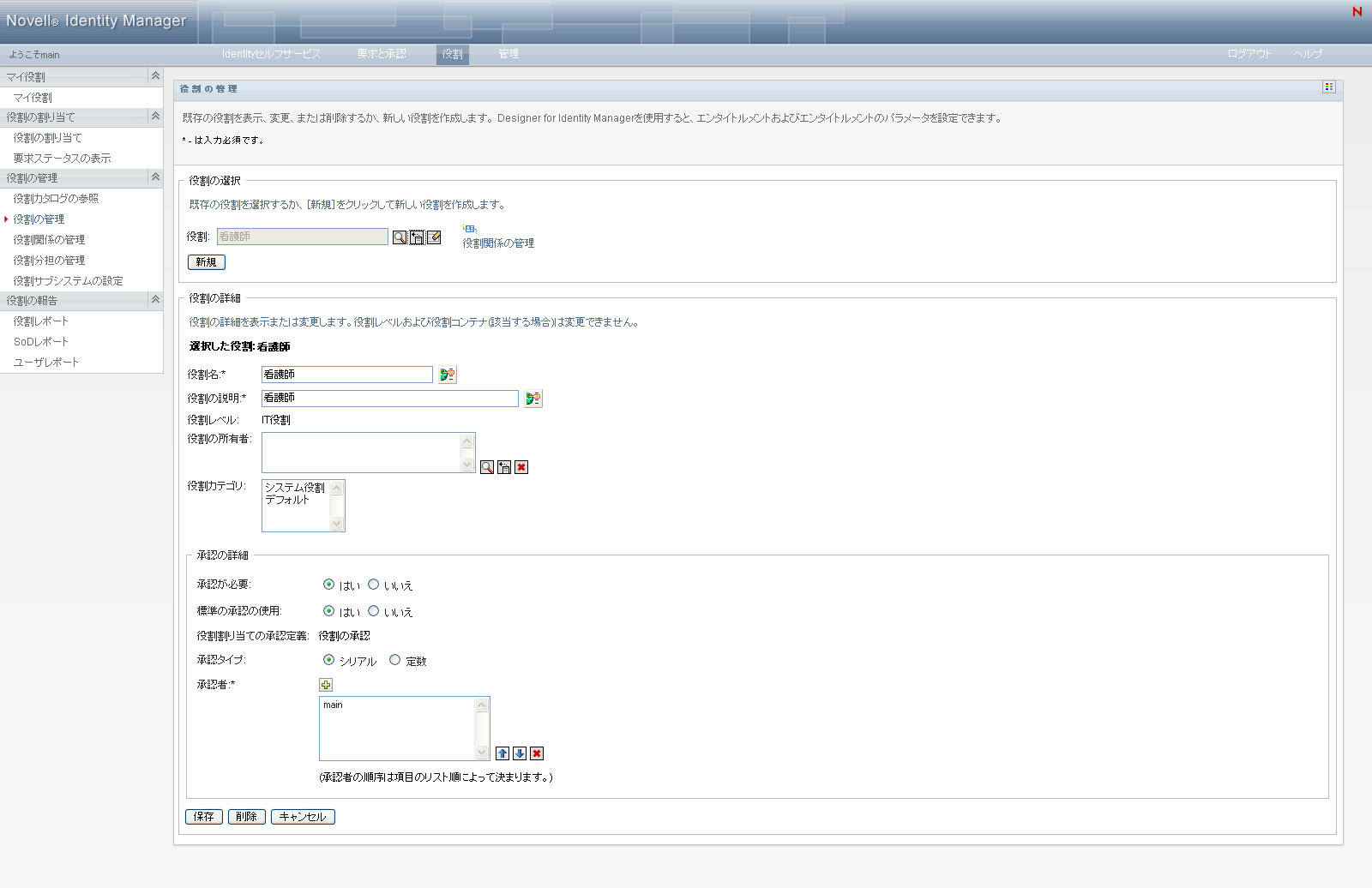 Identity Managerユーザインタフェースの[]タブにある[]アクションでは、新規の役割の作成や、既存の役割の変更または削除ができます。