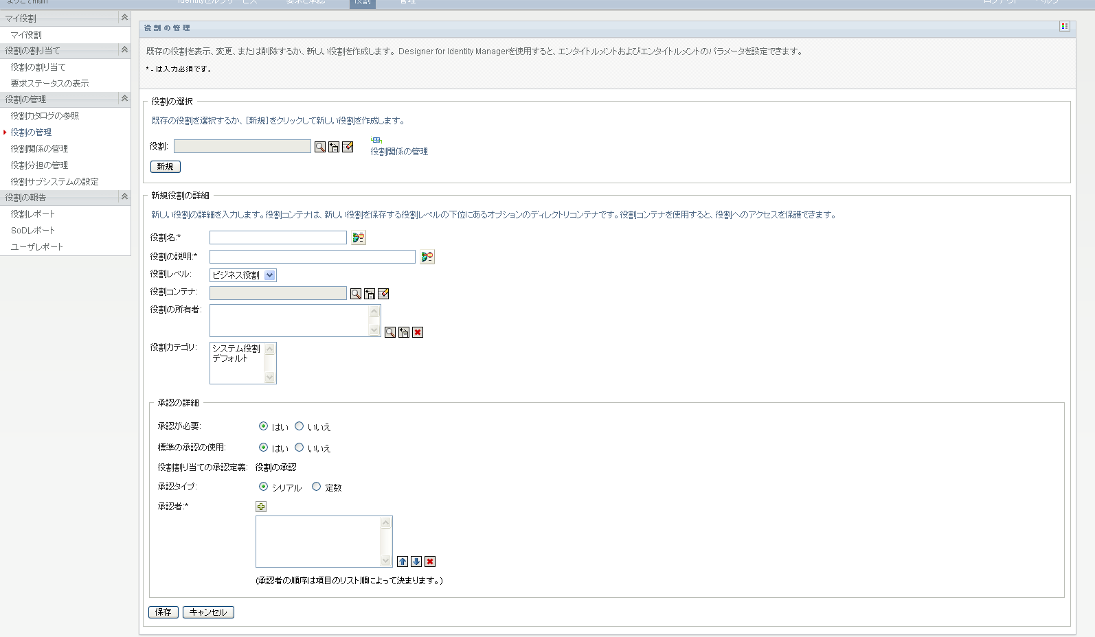 ユーザアプリケーションでは、[役割の管理]ページの[]セクションに[]を入力するように要求されます。このセクションにある各フィールドの詳細については、表 17-2, 役割の詳細を参照してください。