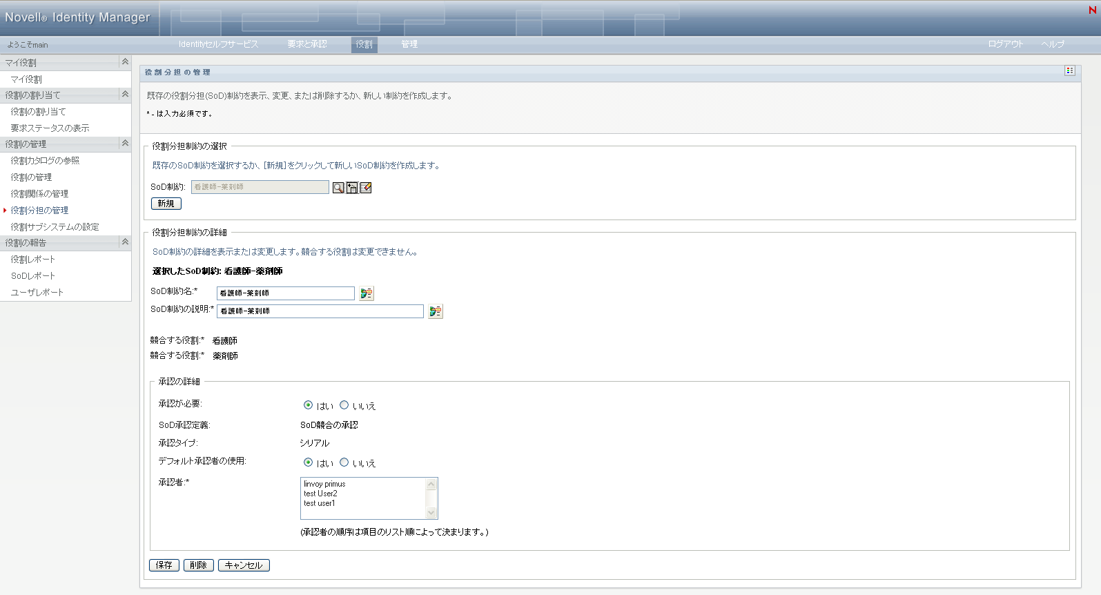 フィールドへの入力については、表 17-5, 役割分担制約の詳細および表 17-6, 承認の詳細を参照してください。