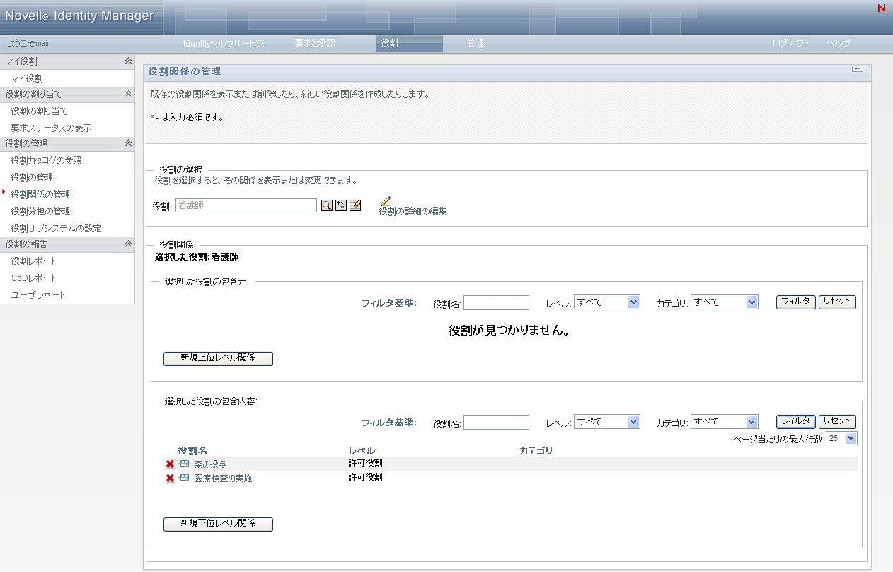 中間レベルの役割(IT役割)は、下位レベルの役割を含むことができ、上位レベルの役割に含めることができます。[役割関係]ページでは、新規下位レベル役割または新規上位レベル役割のいずれかを追加できます。