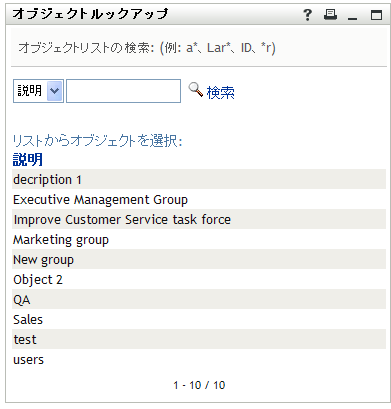 []選択ボックスが空の場合は、[]アイコンをクリックして、[オブジェクトルックアップ]ウィンドウを開きます。チームメンバーを探すための検索条件を指定して[]をクリックし、チームメンバーを選択します。