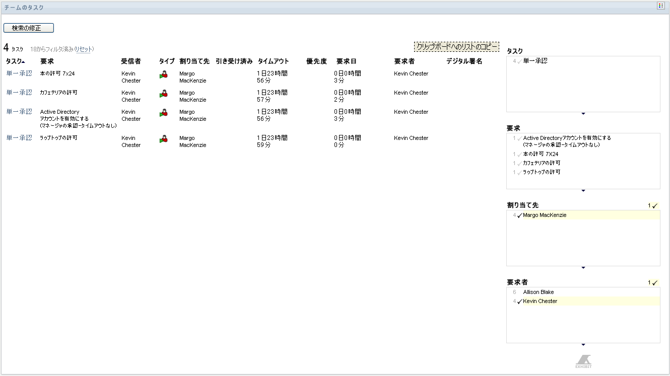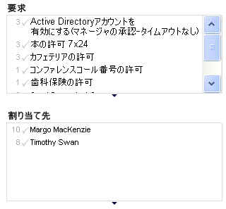 たとえば、[割り当て先]フィルタでMargoの名前をクリックして、[要求者]フィルタでKevinの名前をクリックした場合、図 12-4に示すように、Margo Mackenzieに割り当てられていて、かつKevin Chesterが要求したタスクのみが表示されます。
