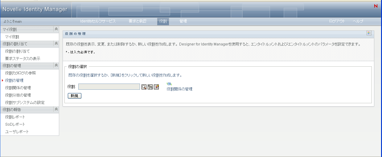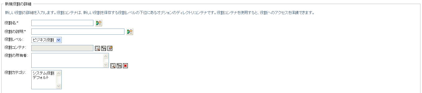 ユーザアプリケーションでは、[役割の管理]ページの[]セクションに[]を入力するように要求されます。このセクションにある各フィールドの詳細については、表 17-2, 役割の詳細を参照してください。