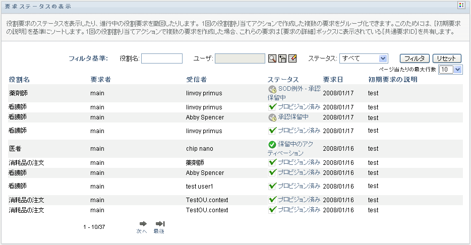 大量の結果セット デフォルトでは、[要求ステータスの表示]ページを実行すると、最大 10,000の要求オブジェクトが取得されます。それよりも大量の結果セットを取得しようとすると、制限に達していることを示すメッセージが表示されます。この場合、検索条件を絞り込んで(特定のユーザまたはステータスを指定するなど)、結果セットに返されるオブジェクト数を制限する必要があります。役割名にフィルタを適用すると、返されるオブジェクト数ではなく、表示対象およびその順序が制限されることに注意してください。