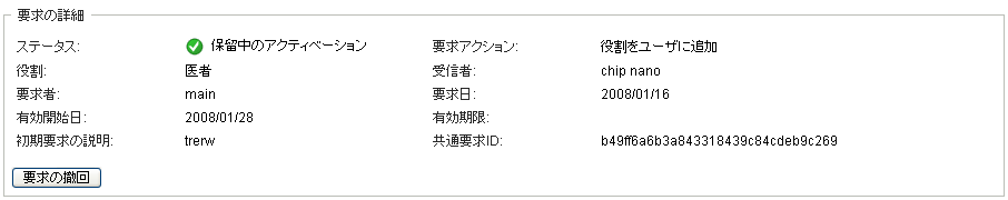 現在認証されているユーザの役割要求のステータスが、ユーザアプリケーションに表示されます。