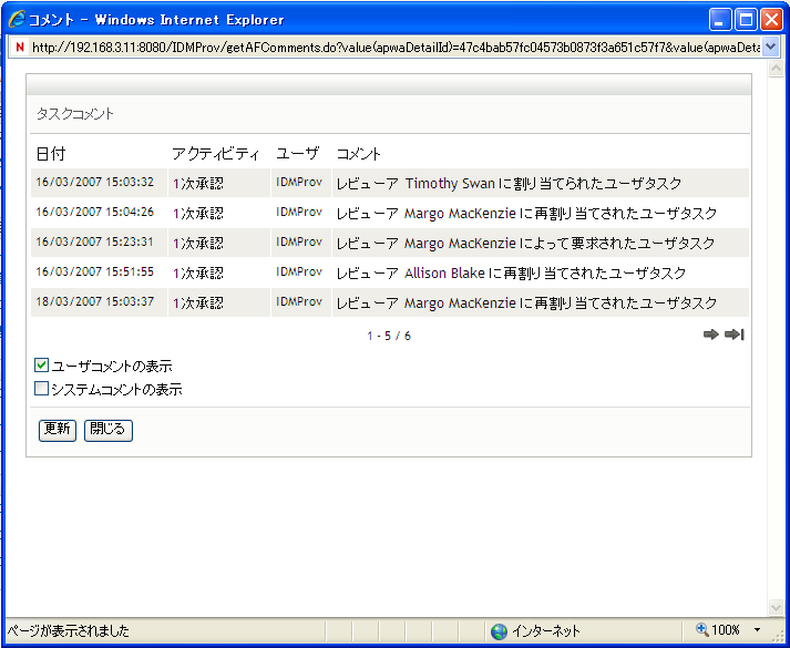 ポップアップウィンドウにユーザおよびシステムコメントが表示されます。 コメントが表示される順序は、各コメントに関連したタイムスタンプにより決定されます。 最初に入力されたコメントが初めに表示されます。 並列承認フローでは、処理中のアクティビティが同時には予測不可能な可能性があります。