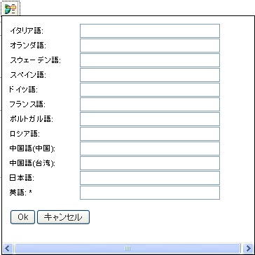 ローカライズ ダイアログボックスを表示します。このダイアログボックスで、ユーザアプリケーションが現在サポートしているロケールにおいてフィールド名や説明に通常使用するテキストを入力できます。