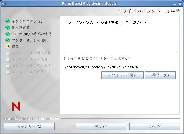 ユーザ資格情報が有効な場合、またはユーザが適切な権限を持っている場合、インストーラにより[ドライバ環境設定ファイル]画面のインストール場所が表示されます。