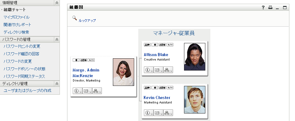 デフォルトでは、Identity Managerユーザアプリケーションにログインすると、[Identityセルフサービス]タブが開き、[組織図]ページが表示されます。