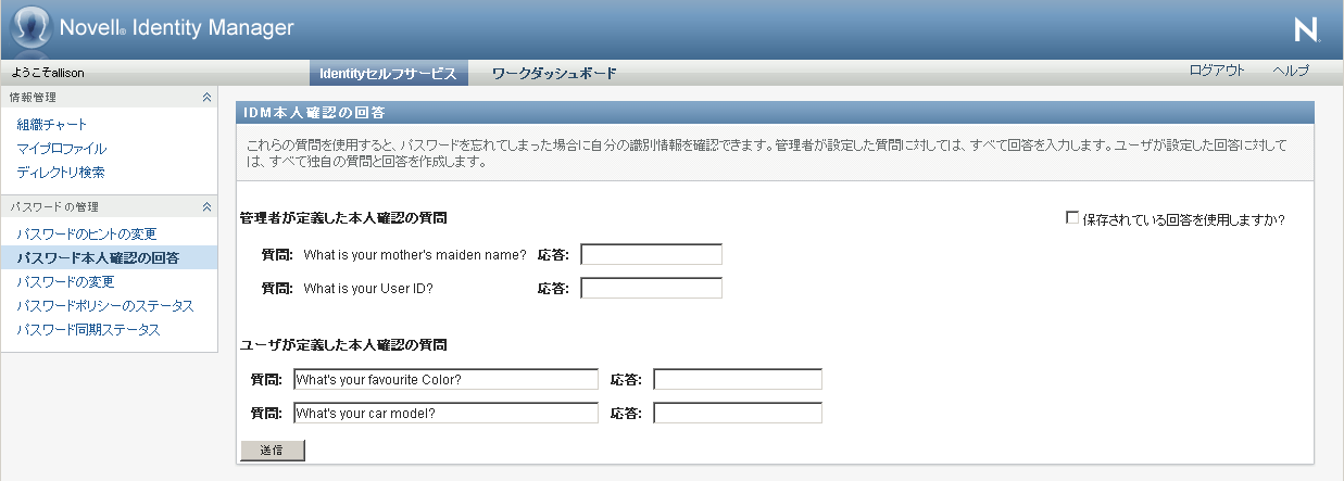 本人確認の質問は、ログイン時に自分のパスワードを忘れてしまったときに、自分が正規ユーザであることを証明する目的で使われます。 システム管理者によって設定されたパスワードポリシーにおいて、この機能が自分に対して有効になっている場合、[パスワード確認の回答]ページで次の作業を実行できます。