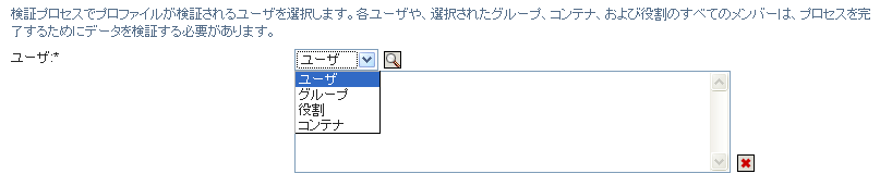 []フィールドで、テキストが読み込み専用になっていることに注意してください。ユーザプロファイル検証プロセスでは、検証者は[]フィールドで選択されたユーザと、[]フィールドで追加した任意のグループ、役割、およびコンテナのすべてのメンバーです。これは、各ユーザは自身のプロファイルの検証者でなければならず、他のユーザは他のユーザの検証者になることはできないためです。