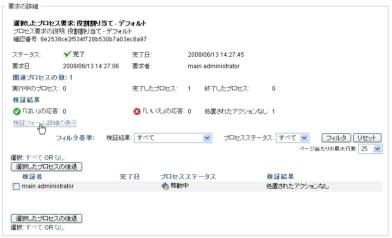 []アクションでは、検証要求のステータスを参照できます。また、要求に対して開始された各ワークフロープロセスの詳細ステータスを表示するオプションも提供し、またオプションで1つまたは複数の実行中プロセスを撤回することもできます。