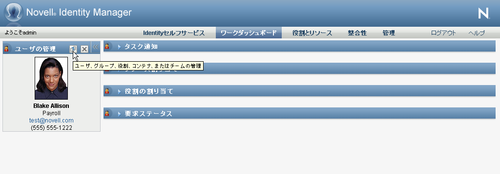 1. [ユーザプロファイル]セクションにある[管理]、[ユーザ]、[グループ]、[役割]、または[コンテナ]ボタンをクリックします。