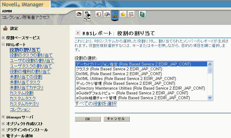 各レポートでは、割り当てられているメンバーの一覧を生成する役割などの初期情報を入力する必要があります。この情報を入力したら、[OK]をクリックします。iManagerによりレポートが生成されます。