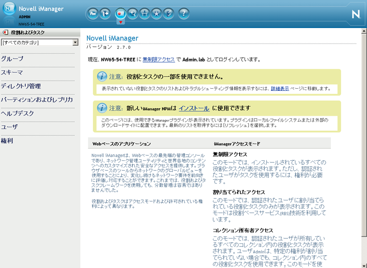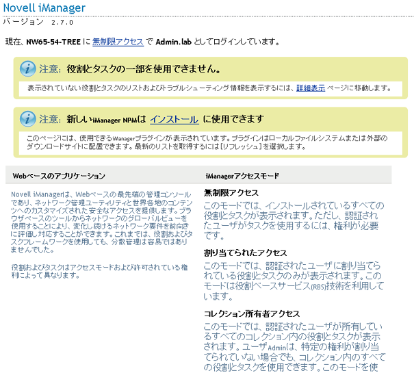 タスクが選択されていない場合、コンテンツフレームには、iManagerへのアクセス権に関する一般情報を含むiManagerホームページが表示されます。