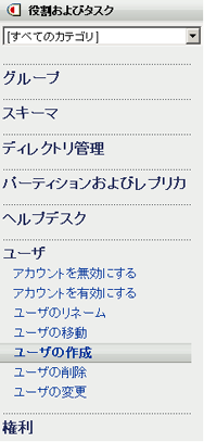 各カテゴリ内のタスクの順序は、適用されるiManagerプラグインの作成元が決定します。 (iManagerに含まれている)基本プラグインのタスクは、通常はその他のプラグインのタスクより前に表示されます。