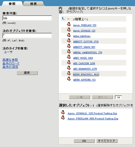 結果リスト: 検索結果が表示されます。デフォルトの結果リストでは1ページ当たり 100個のオブジェクトが表示されますが、オブジェクト数は必要に応じて変更できます。[前]ボタンと[次へ]ボタンを使用すると、結果ページ間をナビゲートできます。
