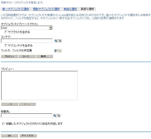 一度に複数のオブジェクトに適用できるタスク(ユーザの変更など)について、iManagerでは、目的のオブジェクトを特定するためのオプションをコンテンツフレームで選択できます。