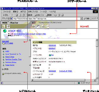 [参照]ページでは、ユーザのツリー内にある任意のオブジェクトをブラウズできます。ページ最上部のナビゲーションバーに、表示中のオブジェクトが存在するサーバ、およびオブジェクトへのパスが表示されます。ページの左側にあるレプリカフレームで、実パーティション上の同じオブジェクトを表示またはアクセスできます。ページ内の下線付きオブジェクトをクリックすると、オブジェクトに関する詳しい情報が表示されます。また、ナビゲータフレーム内にある名前の任意の部分をクリックすると、ツリーの上の階層をブラウズできます。