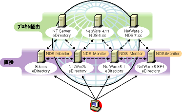 ダイレクトモード: ダイレクトモードが使用されるのは、WebブラウザがポイントしているコンピュータとWebブラウザが読み込んでいる情報を保持しているコンピュータが同じ場合、つまりWebブラウザが、iMonitorの実行ファイルを実行しているコンピュータ上のアドレスまたはDNS名を直接ポイントしていて、同時にそのコンピュータのローカルeDirectory DIB上の情報だけを読み込んでいる場合です。