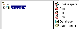 この場合、Accountingオブジェクトを右クリックして[オブジェクトのトラスティ]を選択し、Amyをトラスティとして追加します。次に、Amyに与える権利を選択して[OK]をクリックします。これでAmyに、Databaseアプリケーション、Bookkeepersグループ、LaserPrinterプリンタ、およびAmy、Bill、Bobのユーザオブジェクトを管理する権利が与えられました。
