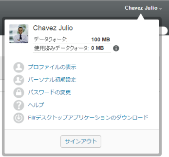 名前リンク: Filrページの右上隅にある、リンクになっている自分の名前をクリックすると、次のオプションが表示されます。