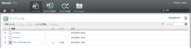 初めてWebブラウザでNovell Filrを起動すると、[マイファイル]ページが表示されます。自分が作成したファイルは、すべてこのページから管理できます。