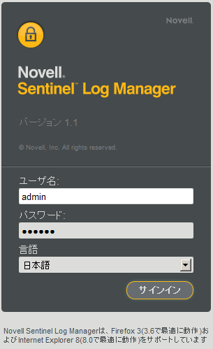 インストール時に作成された管理者ユーザは、Webインタフェースにログインして、Sentinel Log Managerの環境設定を行ったり、使用したりすることができます。