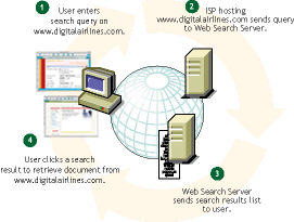 In Figure 5, the user enters a search query in a search form found on www.digitalairlines.com (1 and 2). When the user clicks the Search button, the query is sent to search.digitalairlines.com, which is hosted by the NetWare Web Search Server (3), which then processes the query using index files that were created using the Web Search Manager.