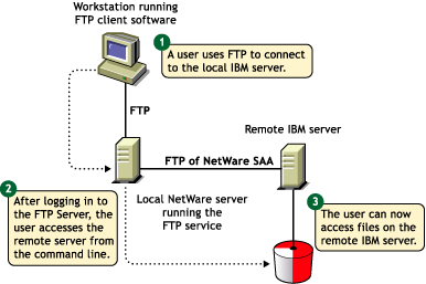 The NetWare FTP Server uses the AFTP Gateway component of NetWare SAA to access remote IBM servers.