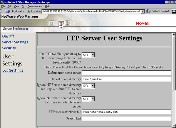 Configuring FTP Server from NetWare Web Manager