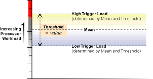 この状況の場合、過負荷プロセッサのスレッドが負荷不足プロセッサに移動され、負荷が分散されます。平均負荷、負荷分散しきい値、高トリガ負荷、および低トリガ負荷の関係について、次の図を参照してください。