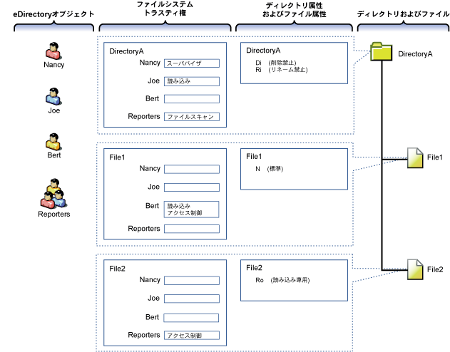 NetWareアクセス制御モデルでは、ユーザやグループのようなeDirectoryオブジェクトに、NSSボリュームおよびNCPボリューム上のディレクトリおよびファイルに対する、ファイルシステムのトラスティ権が割り当てられます。このトラスティ権で、ディレクトリやファイルを操作できるユーザまたはグループが決定されます。ただし、ディレクトリやファイルの属性で操作が許可されているという条件が付きます。