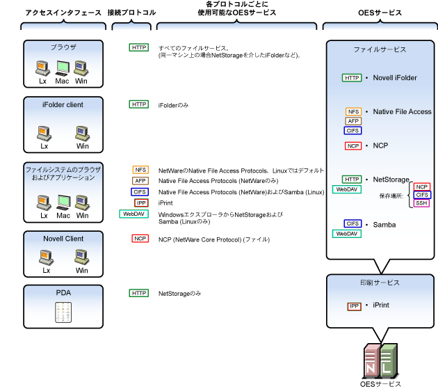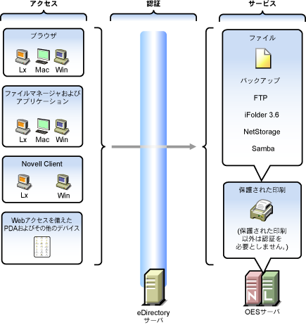 図 16-1はOES 2サービスでサポートされているアクセス方法を示します。Novell® eDirectory™は、各サービスへの認証を提供します。