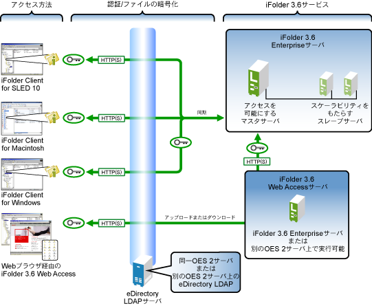 Novell iFolder 3.6: ローカルでアクセスできるOES 2サーバ上のファイルのマスタコピーを保存する、Webベースおよびネットワークベースのリポジトリ(Novell iFolderサーバ)を提供します。
