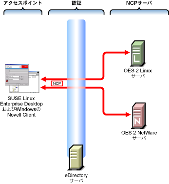 NetWare Core Protocol: NCP™ (NetWare Core Protocol™ )で、NetWareサーバに、またOES 2 Linuxサーバパーティションで定義するNCPボリューム(NSSボリュームを含む)にアクセスできるようにします。