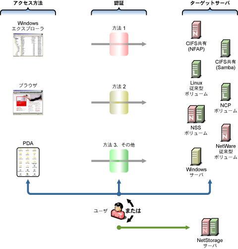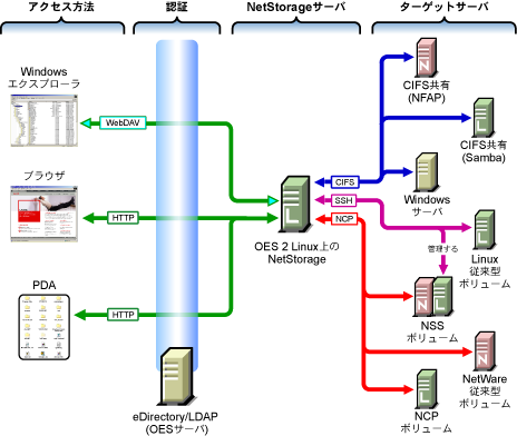 NetStorage: Linux、NetWare、Windowsの各種ファイルサービスへのネットワークアクセスとWebアクセスを提供します。